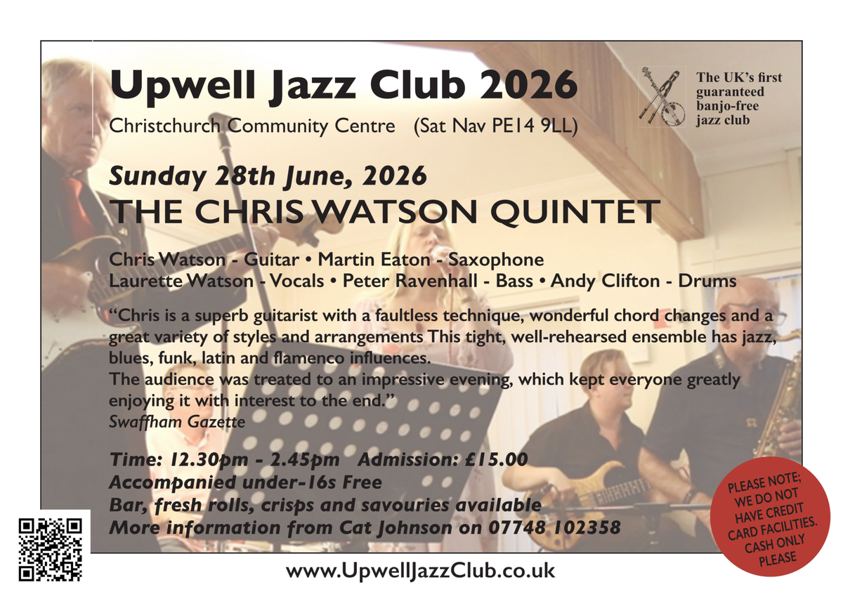 | The Chris Watson Quintet | Sun 28th Jun | Music from 12:30 to 2:45pm | Upwell Jazz Club, Christchurch Community Centre PE14 9LL | £15 CASH on the door | Details |
