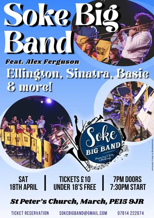 | Soke 17 Piece Big Band - Jazz and Swing | Sat 18th Apr | Doors 7pm - Start 7:30pm | St. Peter's church, March PE15 9JR | £10 - under 18's free | Details |